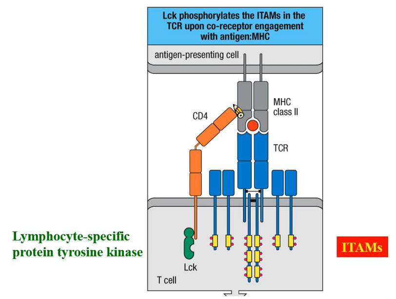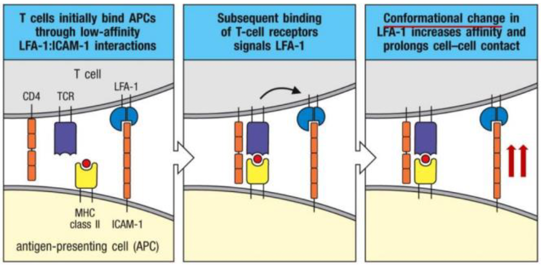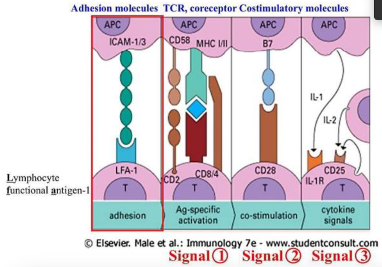 1. T cell 的 LFA 先結合 APC 的 ICAM 1 (弱)