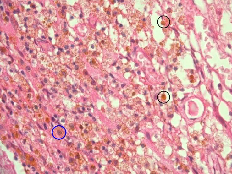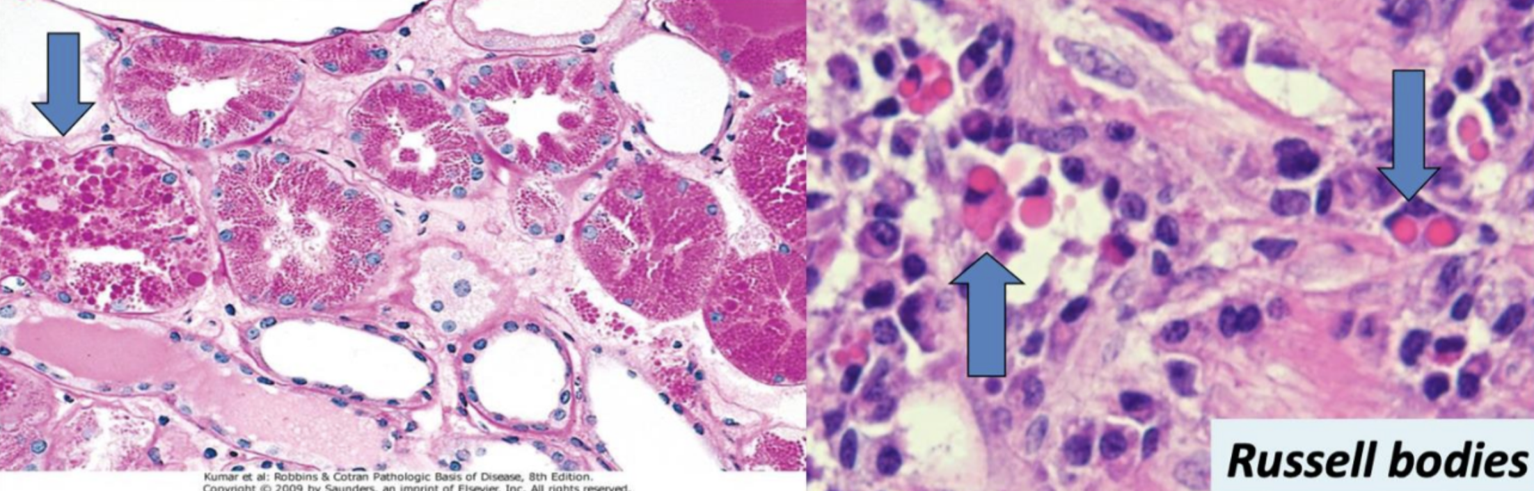 合成過多的分泌性蛋白:漿細胞分泌免疫球蛋白(immunoglobin)後儲存在細胞內形成Russell bodies