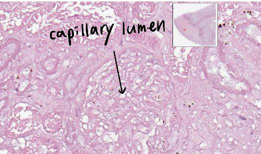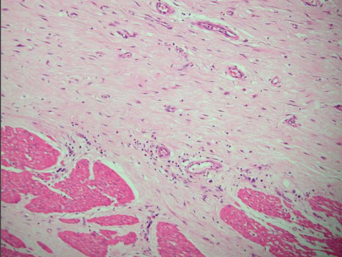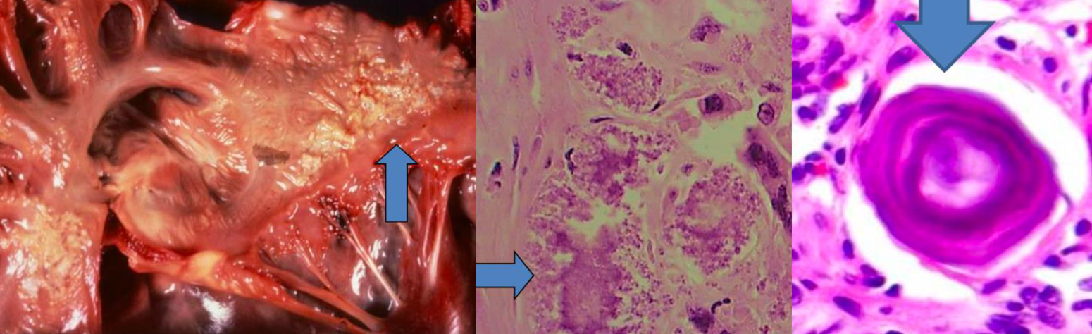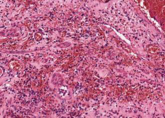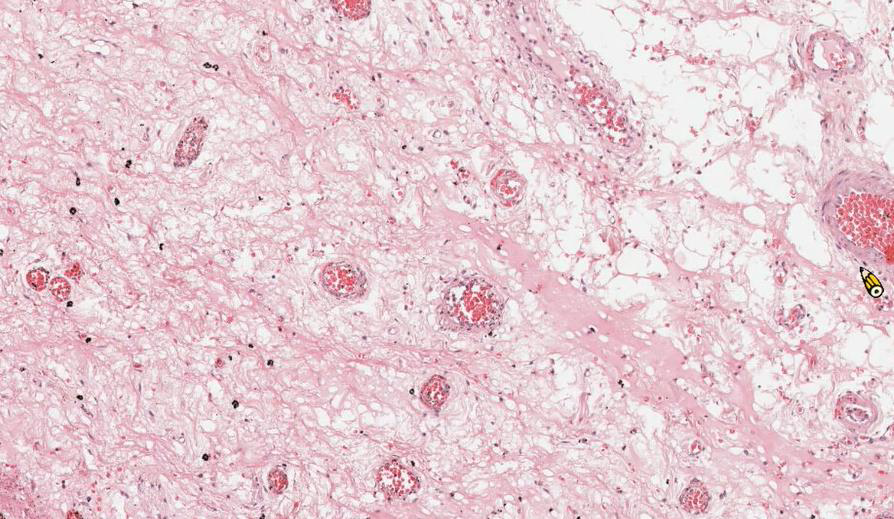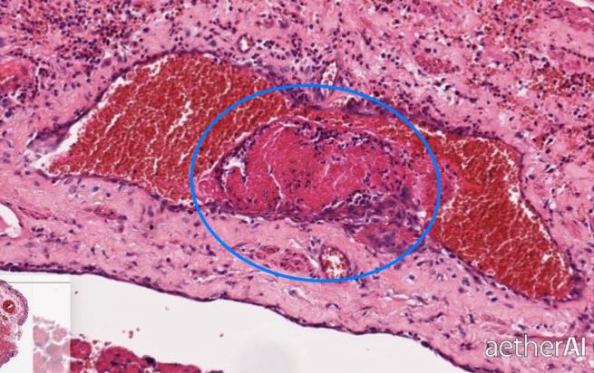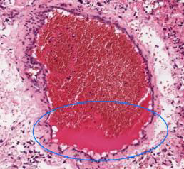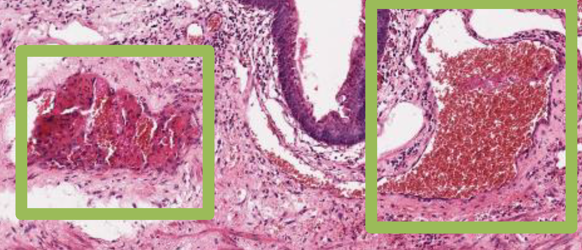 若是血栓形成較久(右圖左),organization會較完整,則血栓內的顏色較淡、fibrin較多、有較多內皮細胞。要與congestion(右圖右,也就是剛形成的fresh thrombus)區分。