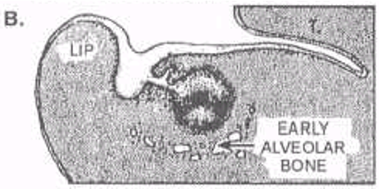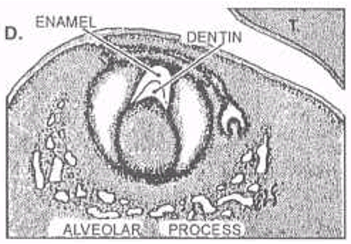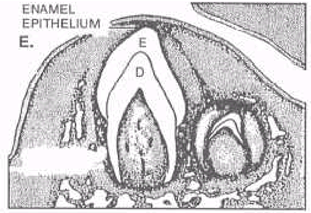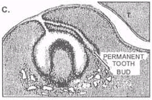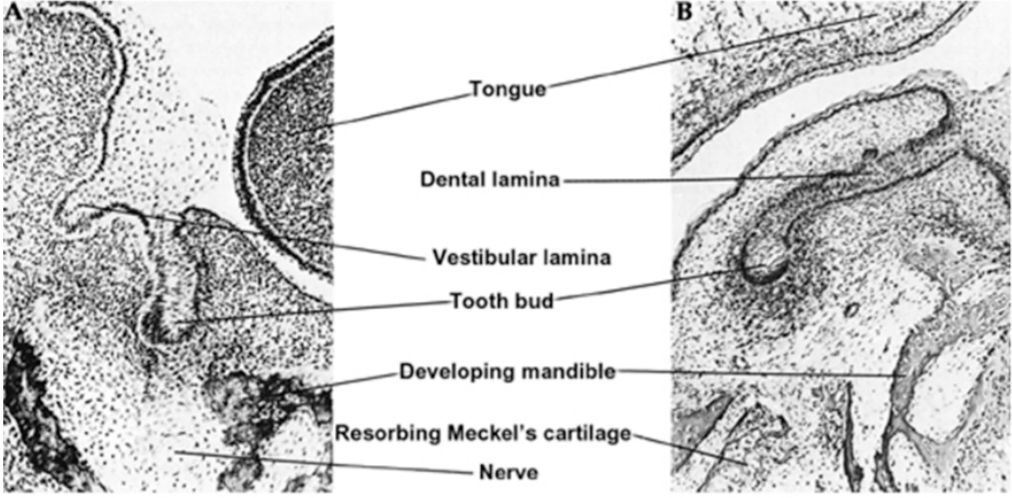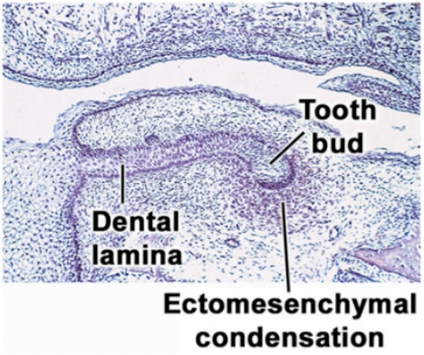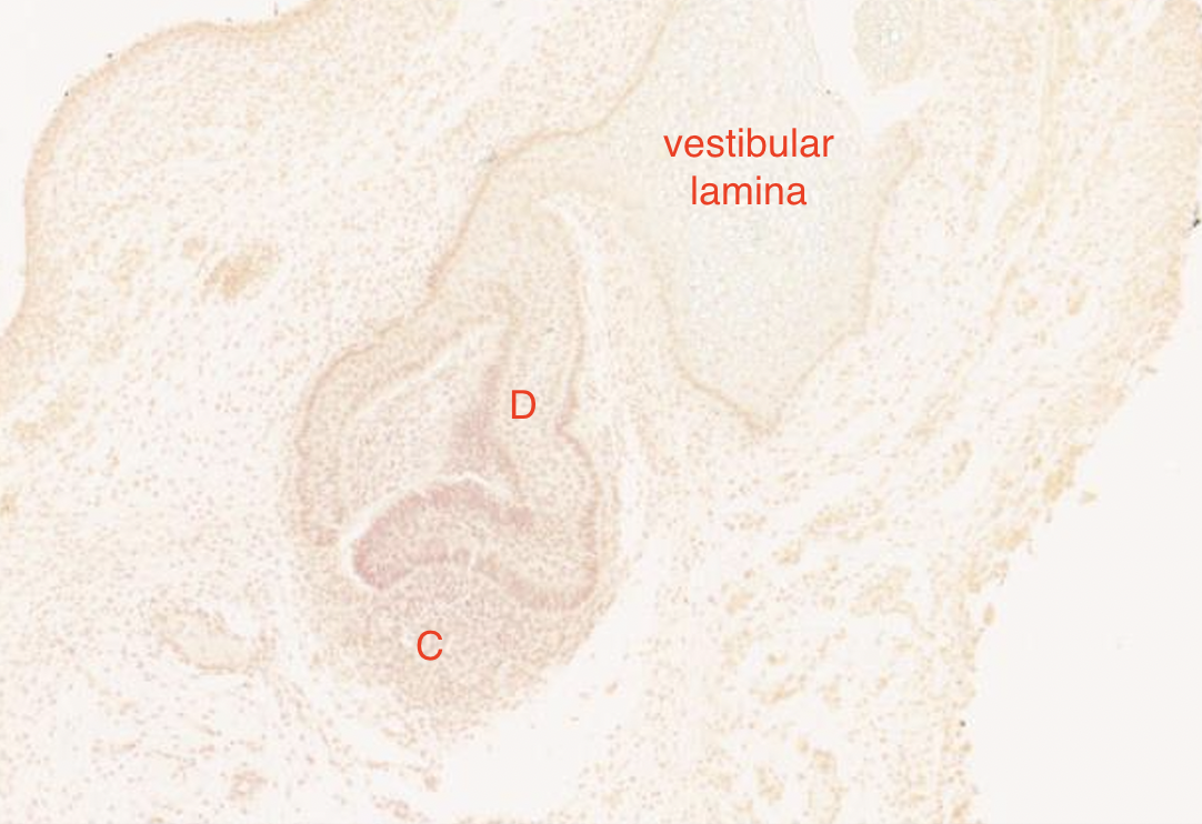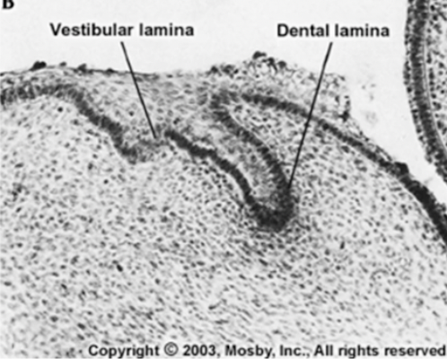 Primary epithelial band 侵入外胚層間葉組織(ectomesenchyme),形成 Dental, Vestibular lamina