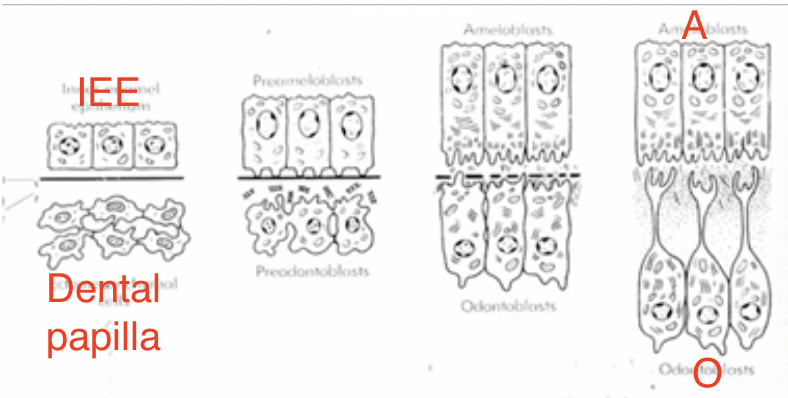 IEE-->pa[preameloblasts]-->a[ameloblasts]-->e[enamel]