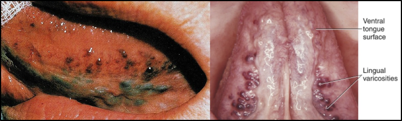 口腔靜脈曲張 (varicosities) (下圖):主要發生在老年人舌腹