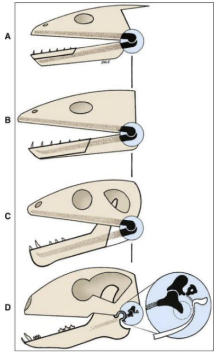 兩生(A),爬蟲(B)由Meckel’s cartilage 終末端和顎方骨(palatoquadrate bar)形成關節