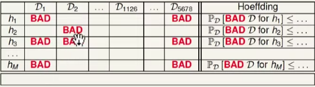 P(Bad)≤P(Bad for hi)≤2Mexp(−2ϵ2N)P(Bad) \leq P(Bad\ for\ h_i)\\ \leq 2M\exp(-2\epsilon^2N)P(Bad)≤P(Bad for hi)≤2Mexp(−2ϵ2N)